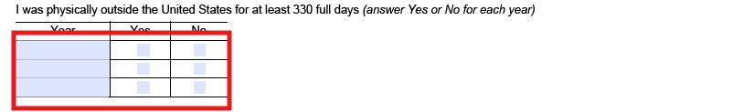 申告期限(延長した場合は延長後期限)が過ぎた直近3年間のうち1年以上において、アメリカに住所を持たず、かつ少なくとも330日以上アメリカ国外にいたこと